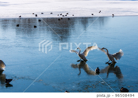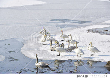 冬の北海道七飯町大沼公園で凍った沼をエサを探し回っている白鳥の風景を撮影