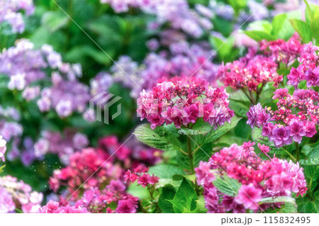 茨城県北茨城市華川町小豆畑 アジサイの名所北茨城あじさいの森の色とりどりの額紫陽花などの群生
