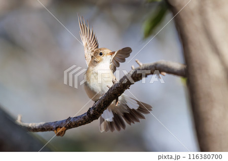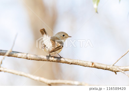 羽ばたき飛び出す尻尾が可愛いニシオジロビタキ(ヒタキ科)。 日本国埼玉県北葛飾郡、まつぶし緑の丘公