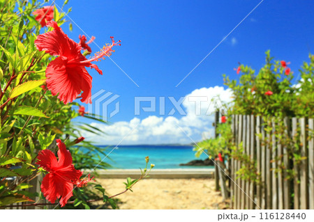 沖縄のイメージ 青い海と青い空と真っ赤なハイビスカス