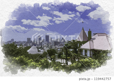 水彩画風 神戸 風見鶏の館と神戸市街 兵庫県神戸市