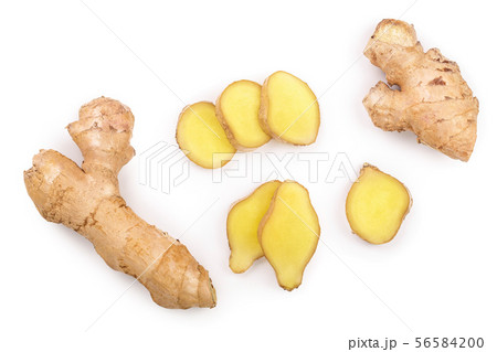 fresh Ginger root and slice isolated on white background. Top view. Flat lay