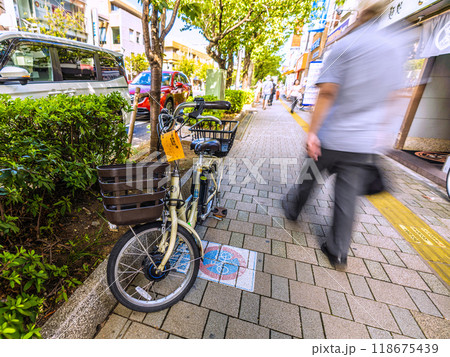 日本の東京都市景観 9月。東急電鉄 桜新町駅前の 自転車・バイク放置禁止区域の放置自転車…
