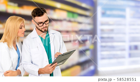 Pharmacist working with colleague in pharmacy.