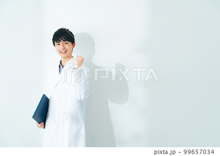 ガッツポーズする白衣を着た若い男性 理系男子 医大生