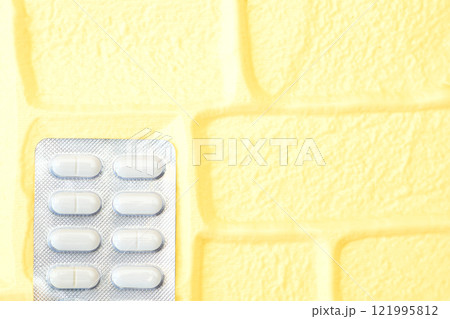 The brown supplement jar without label displayed on beige table top, next to a yellow pill box and a high glass of water. Mock up for advertising product for health, copy space for text