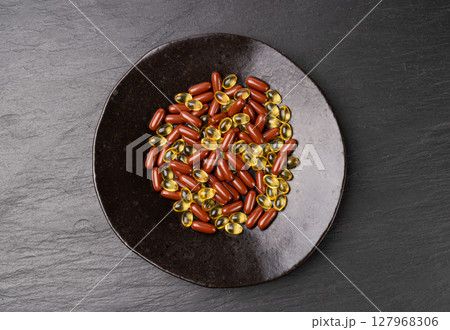 Various pills of different colors and shapes at blue plate over yellow background