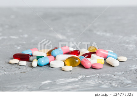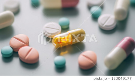 assorted colorful pills and tablets scattered on a smooth light surface closeup medication layout copyspace concept of healthcare pharmacy medicine
