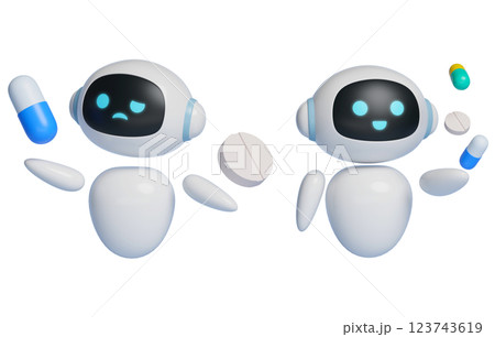 AI robot character 3D graphics floating pill in the air