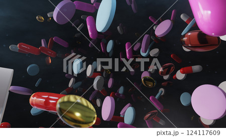 Flying Pills In Night Light, 3D illustration Background for advertising and wallpaper in beauty and medical scene. 3D rendering in decorative concept.