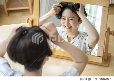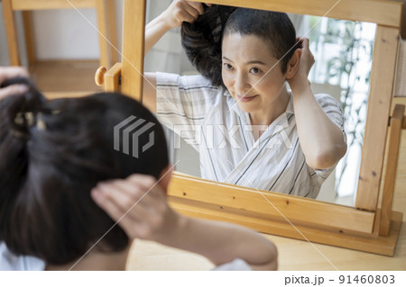 鏡に向かってウイッグをつけるミドルの女性 がん患者アピアランスケア イメージ