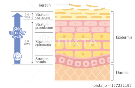 皮膚のターンオーバーの仕組み(約28日周期)表皮の細胞再生と角質層の説明図