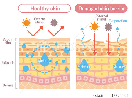 乾燥肌と健康な肌の違いを解説する皮膚構造イラスト(水分蒸発・外部刺激)