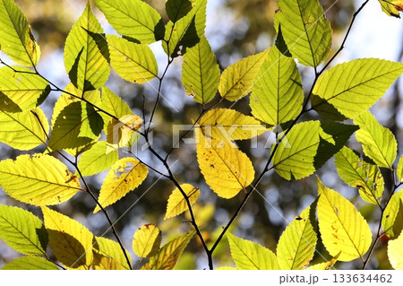 自然 植物 ムクノキ、十一月の雑木林で。日の光を透かして見る控えめな黄葉