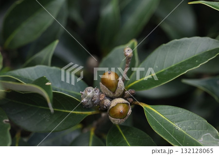 自然 植物 オキナワジイ、石垣島の照葉樹林で。開花から二年目の秋、たわわに実ったどんぐりです