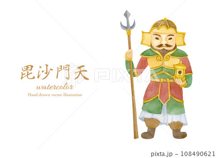 水彩手書きの七福神の毘沙門天