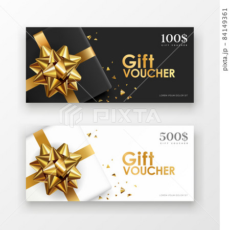Gift vouchers gift box golden ribbon, black and white paper concept design