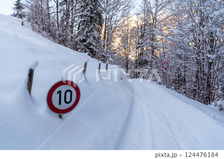 Snow-covered forest road and road sign in the Bavarian Alps, Germany