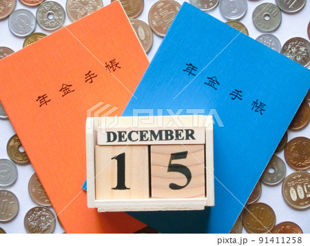 散らばった日本の硬貨を背景に重なった橙色と青色の年金手帳と12月の年金支給日を表した木製カレンダー