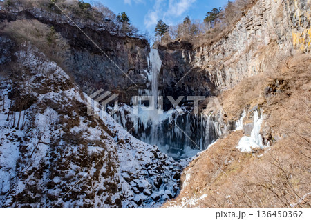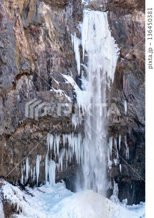 凍り付いてツララができた日光華厳の滝