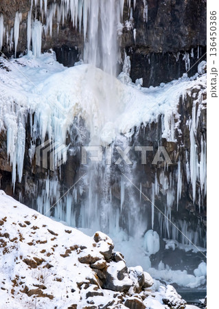 凍り付いてツララができた日光涅槃の滝
