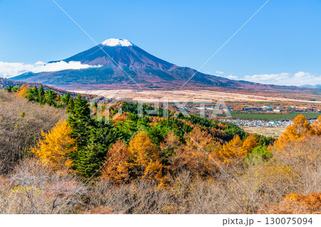 【山梨県】紅葉した秋の二十曲峠から見た雪化粧した富士山