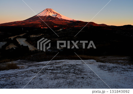 愛鷹山塊の越前岳より 雪化粧した十里木高原展望台より夜明け前の富士山と宝永火口