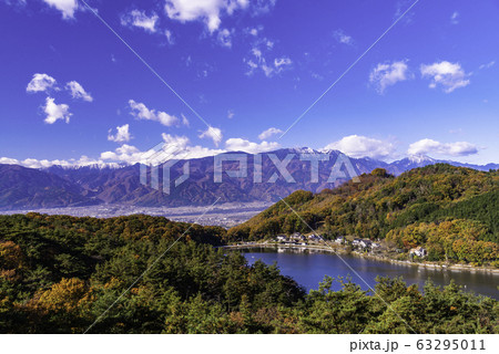 (山梨県)秋の千代田湖と冠雪した南アルプス
