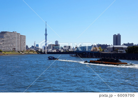 青空が広がる隅田川を下流に向け航行中のタグボートと東京スカイツリー