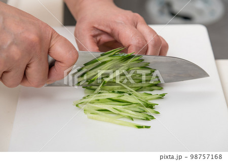 【キュウリを三徳包丁で千切り】