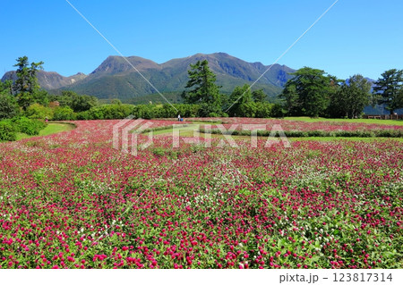 くじゅう連山と満開の千日紅畑(竹田市久住町)