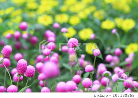 遊歩道に咲き乱れる美しいセンニチコウ(千日紅)の花「くじゅう花公園」大分県竹田市