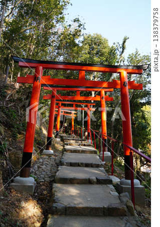 神社に続く鮮やかな朱色の千本鳥居と石段の風景