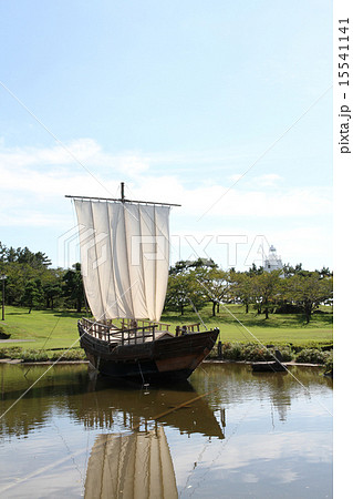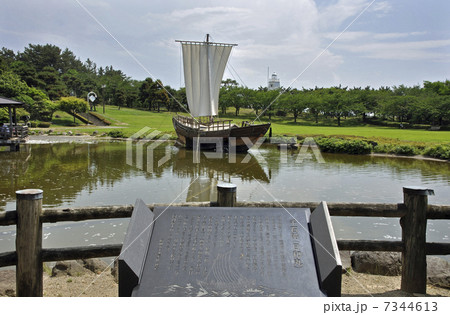 初夏の酒田・日和山公園の池に浮かぶ千石船