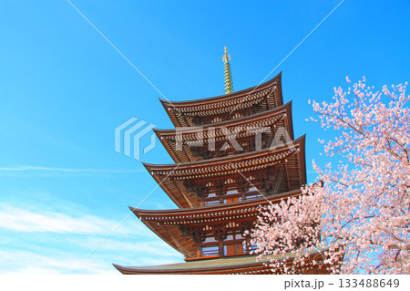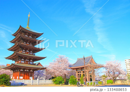 愛知県名古屋市、覚王山日泰寺五重塔と桜の風景