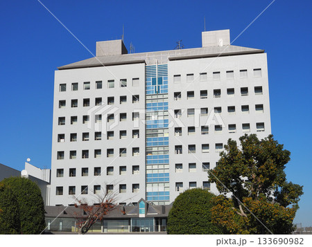 千葉県船橋市湊町にある船橋市役所庁舎と街路樹