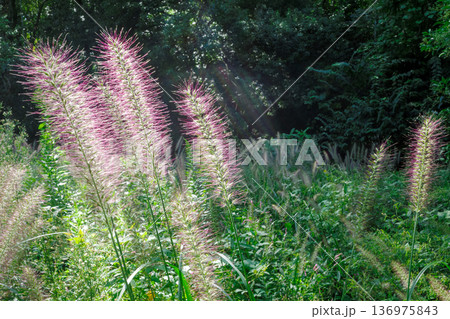 公園の木陰にひっそりと咲く紫のチカラシバに木漏れ日が差し込む