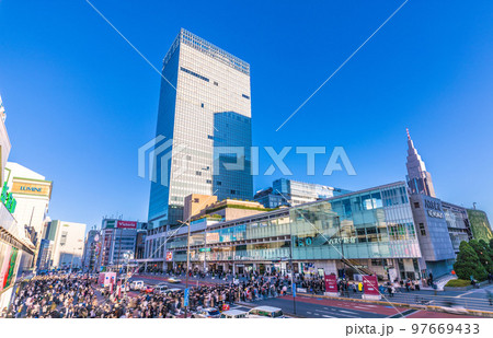 日本の東京都市景観 JR新宿ミライナタワーや新宿高島屋(渋谷区)、NTTドコモ代々木ビル、電車など