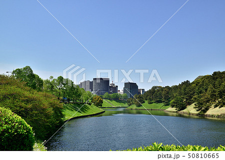 東京 新緑の綺麗なつつじ咲く皇居 桜田濠と放送局などの風景