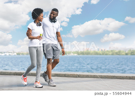 Loving Afro Couple Walking Along River Bank After Morning Jogging