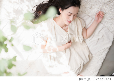 仰向けで目を閉じる美しい大人の女性 お昼寝や睡眠イメージ