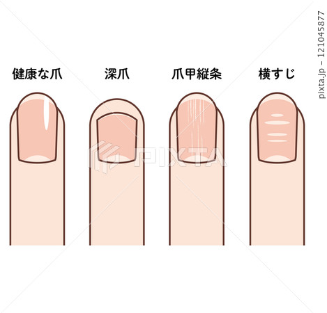 指先のイラスト(健康な爪、深爪、爪甲縦条、波板状爪)