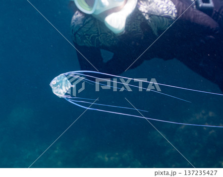水面を漂う美しいけど猛毒の触手を持つカツオノエボシ(カツオノエボシ科)の半水面撮影。伊豆中木ヒリゾ浜