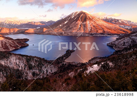 冬の半月山から見る朝焼けの男体山と中禅寺湖