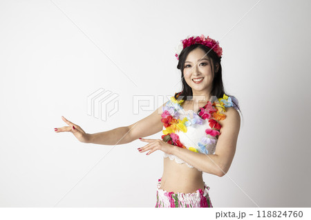 白背景にフラダンサーの女性が笑顔で手を広げている姿