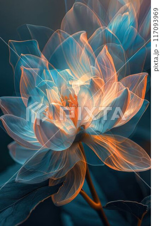 Ethereal Close-Up of a Glowing Lotus Flower with Translucent Petals in Soft Blue and Orange Light