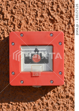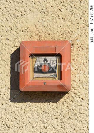 Red fire alarm manual call point on a textured orange wall