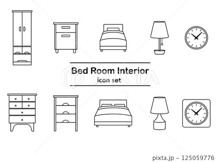 寝室にある家具のシンプルな線画イラストアイコンセット