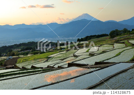 日本の原風景 南アルプスの夜明けの棚田と富士山