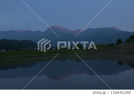 南アルプスの峰々が朝焼けに染まる時水田に映るその姿